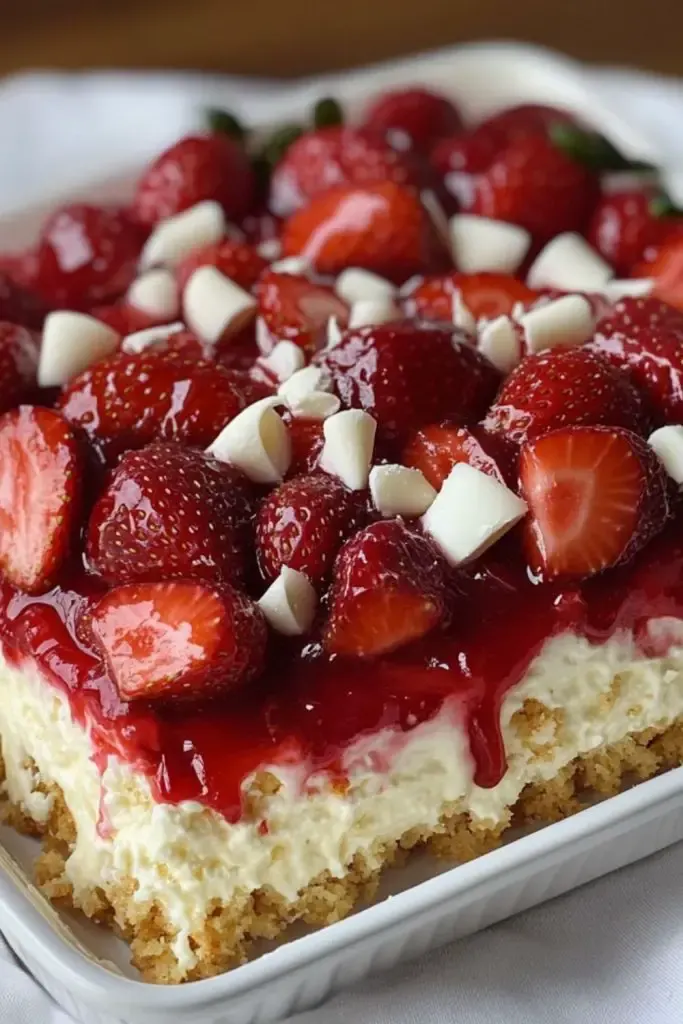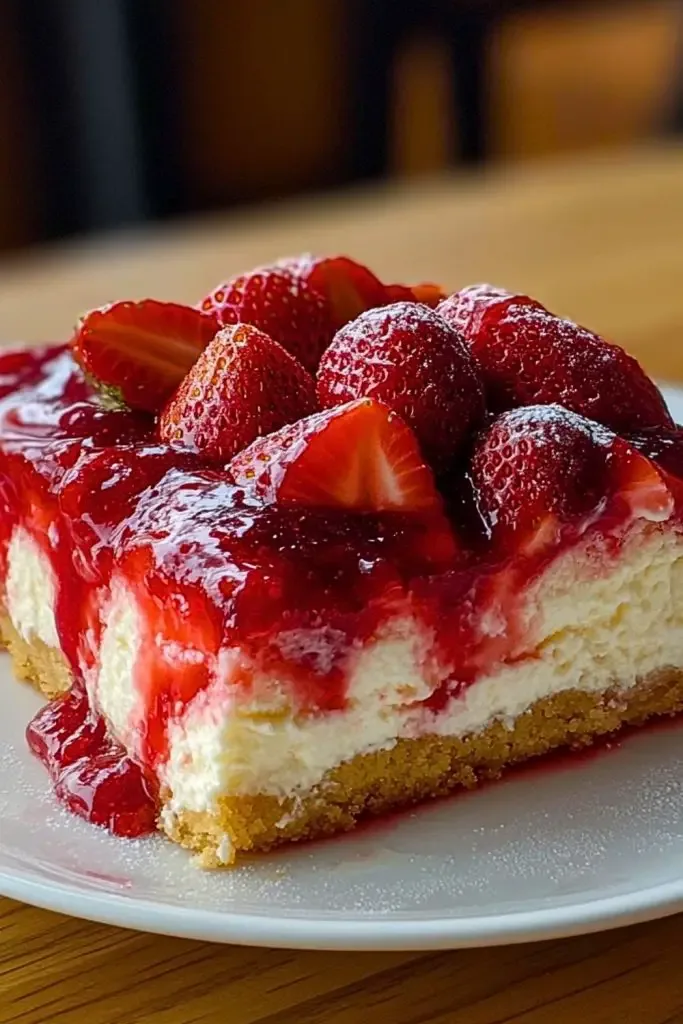 A no-bake, layered dessert made with a buttery graham cracker crust, fluffy cheesecake filling, and sweet strawberry topping. Perfect for warm weather or any celebration, this cake is refreshing, creamy, and irresistibly good.