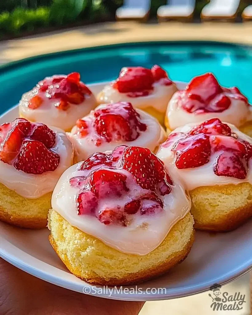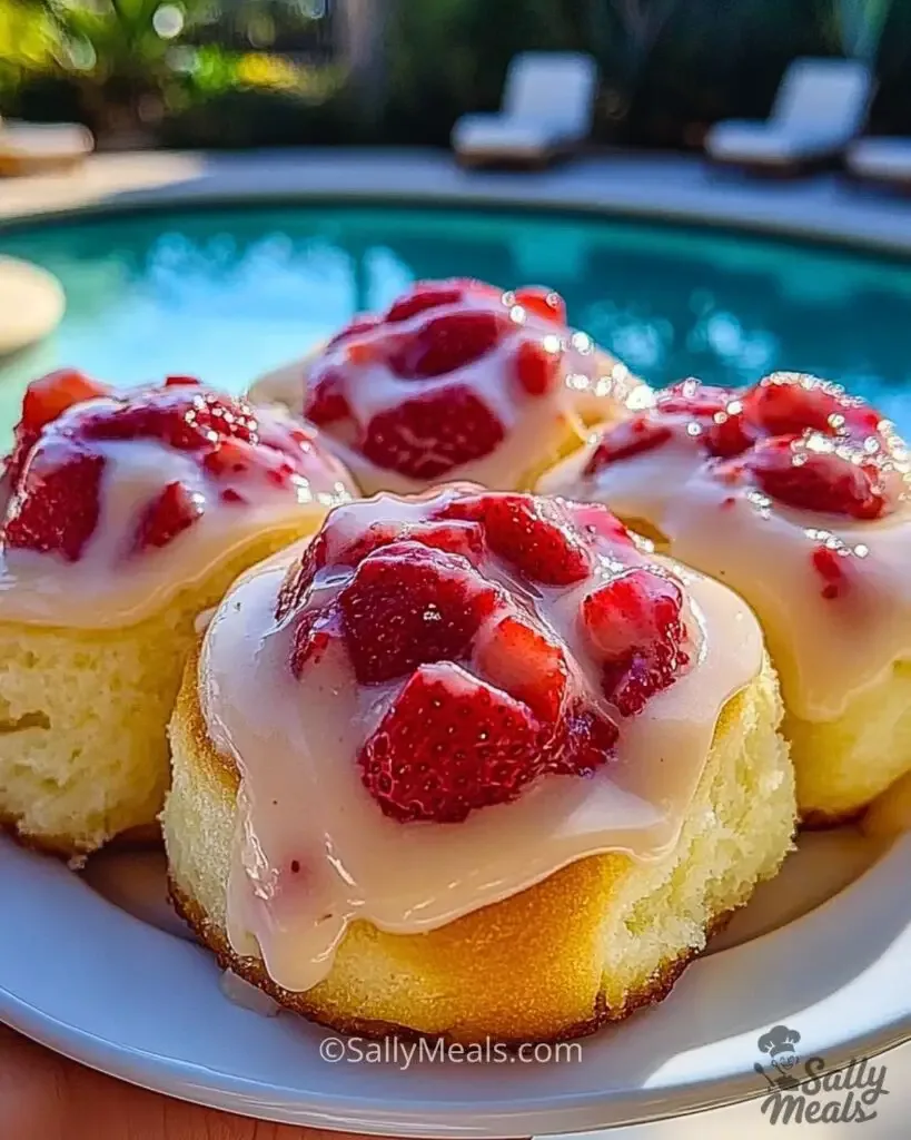 Assemble the Rolls: Spread the cheesecake frosting over the warm rolls, then top with the fresh strawberry mixture. Serve immediately and enjoy!