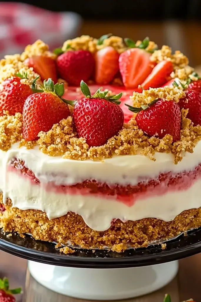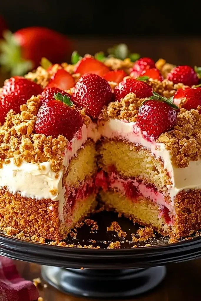 This cake is pure joy from top to bottom. You get layers of dense, moist pound cake paired with a silky strawberry filling and whipped cream, all wrapped up in a playful, nostalgic crunch topping. It’s impressive enough for guests but simple enough to enjoy on a casual weekend. The mix of textures keeps every bite exciting, and the strawberry flavor is fresh, sweet, and slightly tangy — everything you could want in a dessert.
