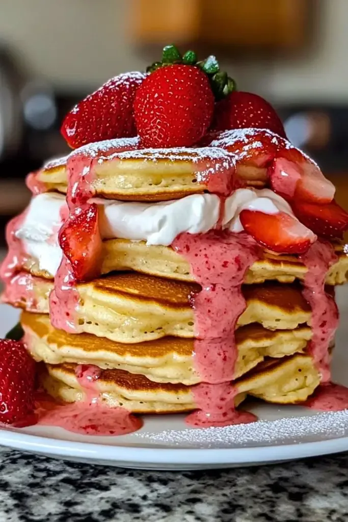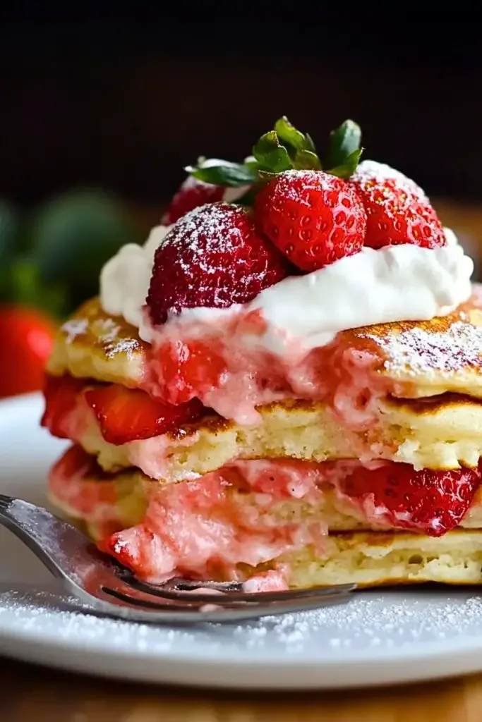 It’s part dessert, part breakfast, and entirely irresistible. Each bite melts in your mouth, combining the airy texture of pancakes with the creamy smoothness of whipped cream and the brightness of fresh strawberries. Whether you're planning a cozy brunch, treating your family, or simply craving something luscious and satisfying, this stack is guaranteed to be a hit.