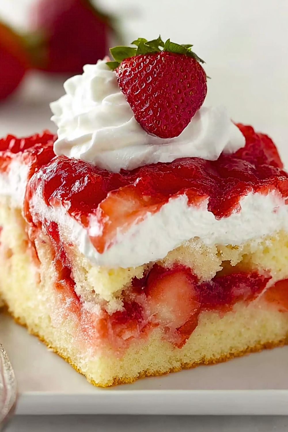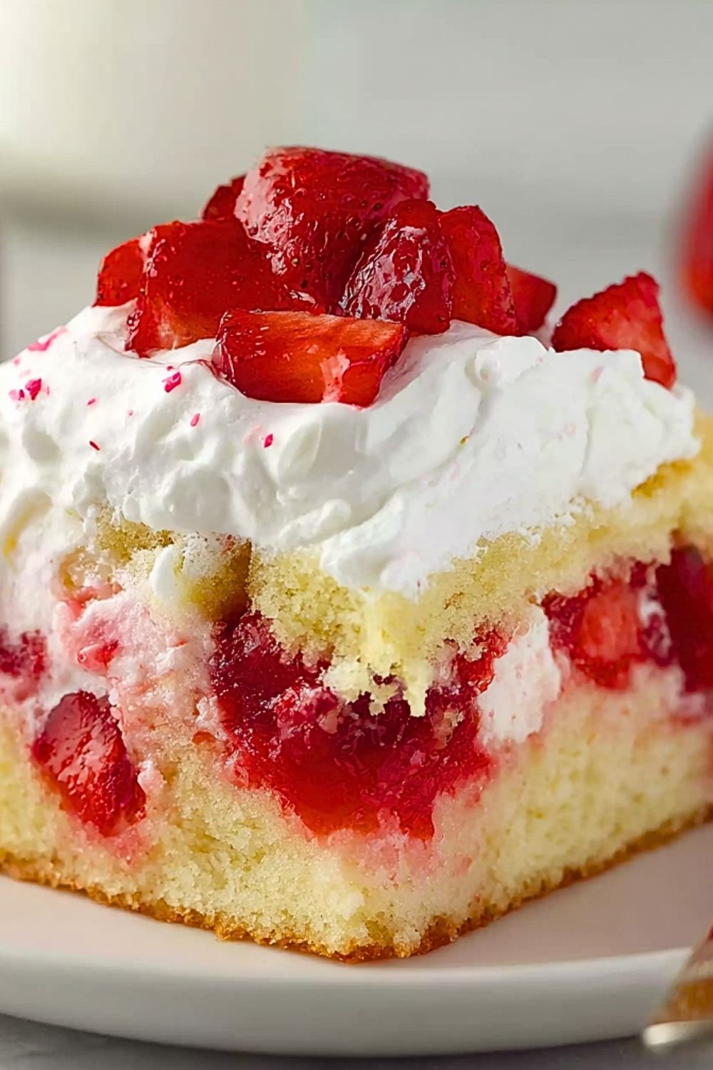 This cake is best when made with fresh, in-season strawberries for the fullest flavor. If fresh berries aren’t available, you can use frozen strawberries—just make sure to thaw and drain them well before macerating. The whipped cream topping can be stabilized with a tablespoon of instant pudding mix or mascarpone cheese if you need it to hold up longer for parties or potlucks. Let the assembled cake sit in the fridge for 30 minutes to an hour before serving so the layers settle and the strawberry syrup seeps slightly into the sponge.
