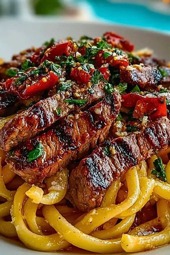Layer the sliced steak over the pasta and spoon any extra sauce from the skillet on top. Garnish with freshly chopped parsley or cilantro and an extra sprinkle of chili flakes if you like it spicy.