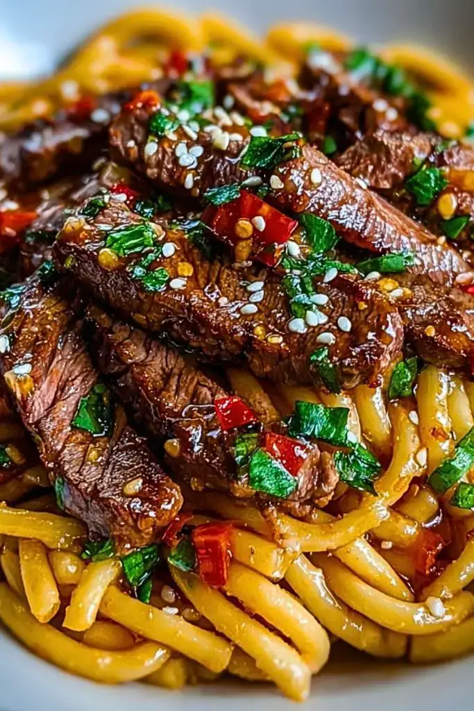 What makes this dish special is the way the sauce ties everything together. The garlic is sautéed until golden, the chili flakes bring a kick that’s just enough to warm the tongue, and the soy-honey glaze coats every strand of pasta and each slice of tender steak. It’s not just a meal—it’s a full flavor experience that feels fancy but is surprisingly easy to pull off on a weeknight.