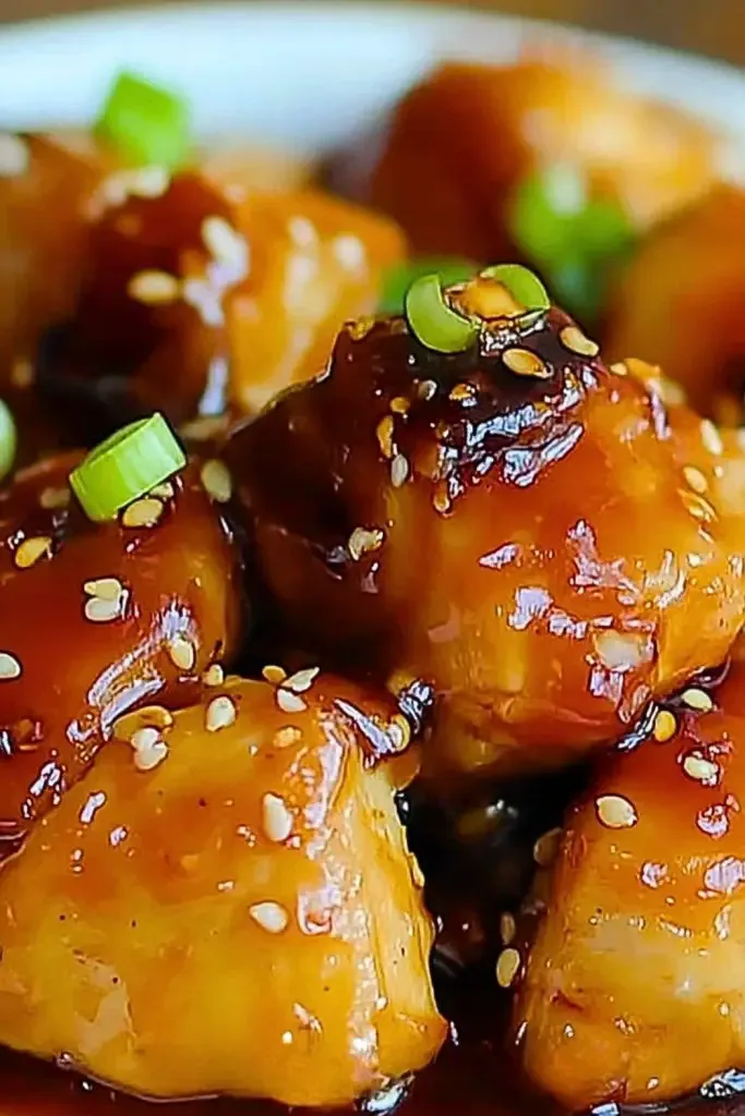 Once cooked, gently stir the chicken to coat it thoroughly with the sauce. Sprinkle sesame seeds and chopped green onions over the top for a vibrant and tasty finishing touch. Serve hot and enjoy the tropical paradise on your plate!