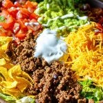 In a large serving bowl or individual bowls, start with a bed of chopped romaine. Add seasoned ground beef, followed by corn, tomatoes, avocado, and shredded cheddar cheese.