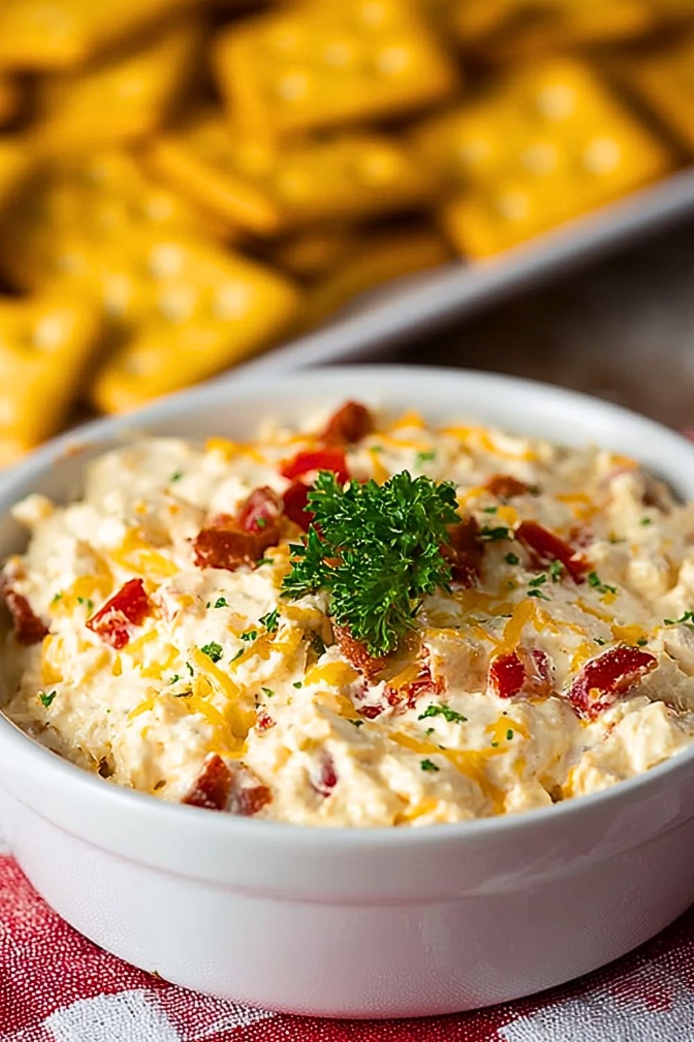 Transfer the dip to a serving bowl, top with a sprinkle of extra shredded cheddar or a sprig of parsley, and serve with crackers, tortilla chips, or veggie sticks.