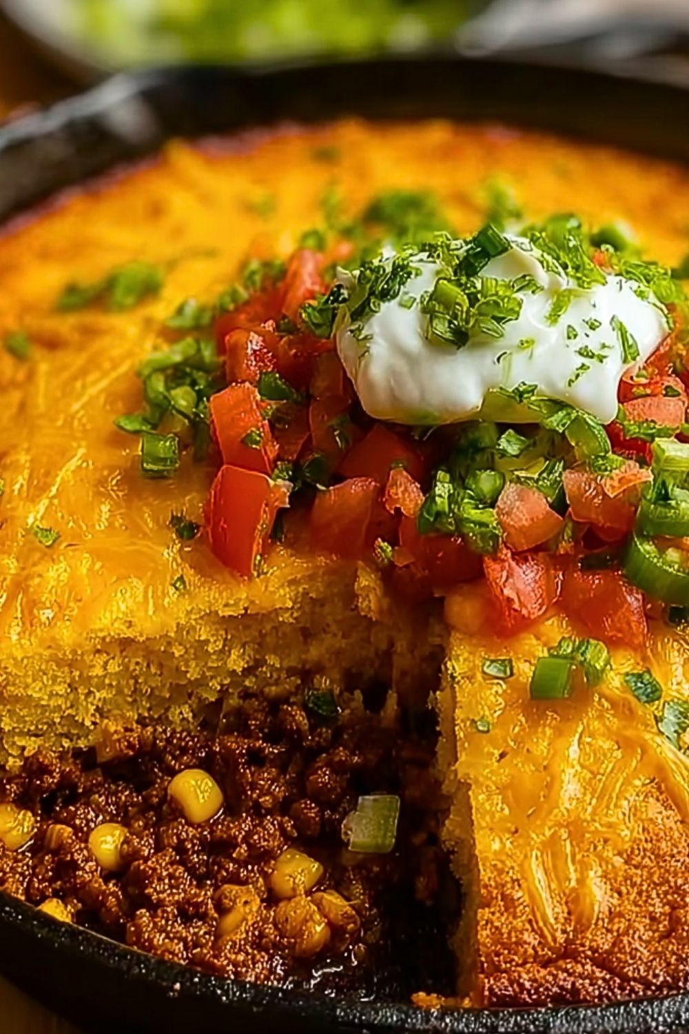 Spoon the cornbread batter evenly over the meat filling in the skillet, smoothing the top gently with a spatula. Sprinkle a bit more cheddar cheese over the top if desired.