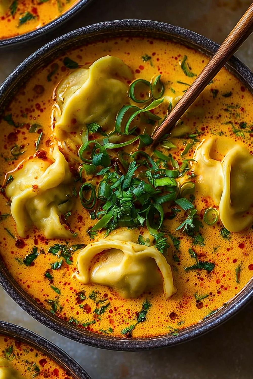 The soup is aromatic and beautifully spiced, thanks to red curry paste, garlic, and ginger, while the dumplings add a tender, chewy contrast that absorbs the rich broth like a sponge. It’s a dish that feels indulgent but is surprisingly simple to make, especially if you use store-bought dumplings. Whether served as a show-stopping starter or a hearty main course, this bowl is guaranteed to impress.
