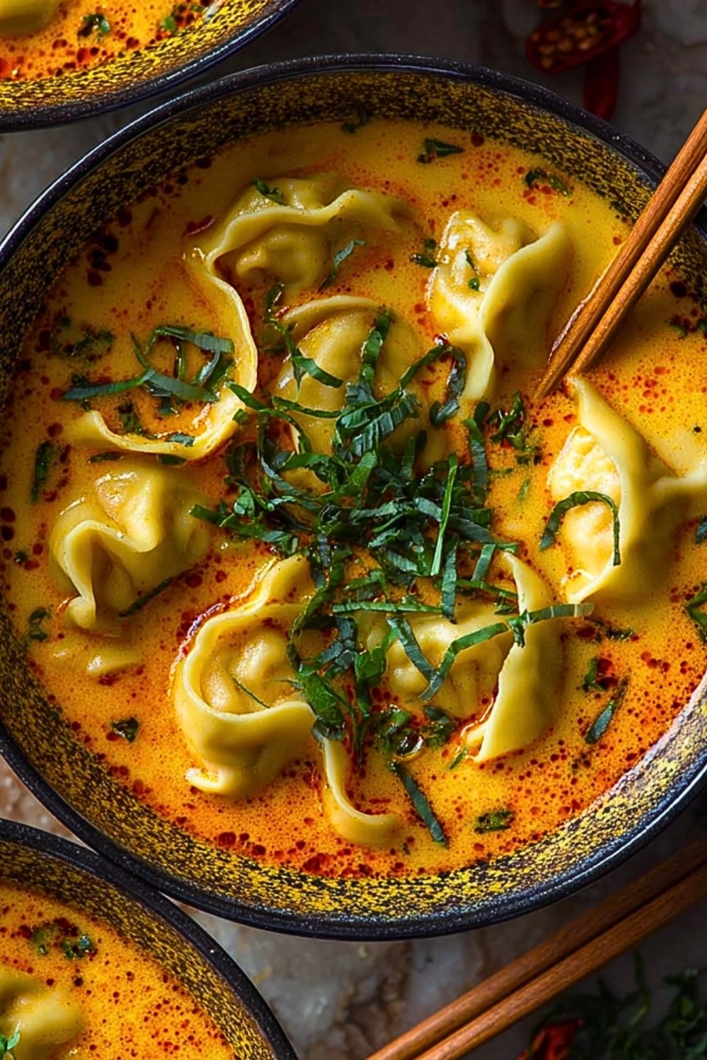Start by gently frying your aromatics (ginger, garlic, onions) to unlock their flavor before adding curry paste—this deepens the soup’s base. Be patient with the coconut milk; let it simmer without boiling, which helps retain its creamy texture. If you’re using frozen dumplings, don’t thaw—add them directly to the soup to avoid sogginess. For an extra layer of flavor, top with chili oil, fried shallots, or fresh herbs like cilantro or Thai basil just before serving. Taste as you go and adjust salt, lime, or sweetness depending on your preference.