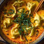 The soup is aromatic and beautifully spiced, thanks to red curry paste, garlic, and ginger, while the dumplings add a tender, chewy contrast that absorbs the rich broth like a sponge. It’s a dish that feels indulgent but is surprisingly simple to make, especially if you use store-bought dumplings. Whether served as a show-stopping starter or a hearty main course, this bowl is guaranteed to impress.