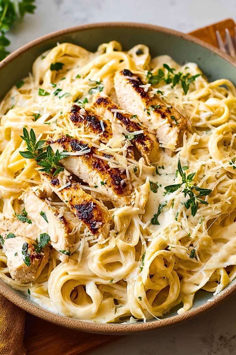 7. Top with sliced chicken and garnish with parsley and extra Parmesan. Serve immediately.