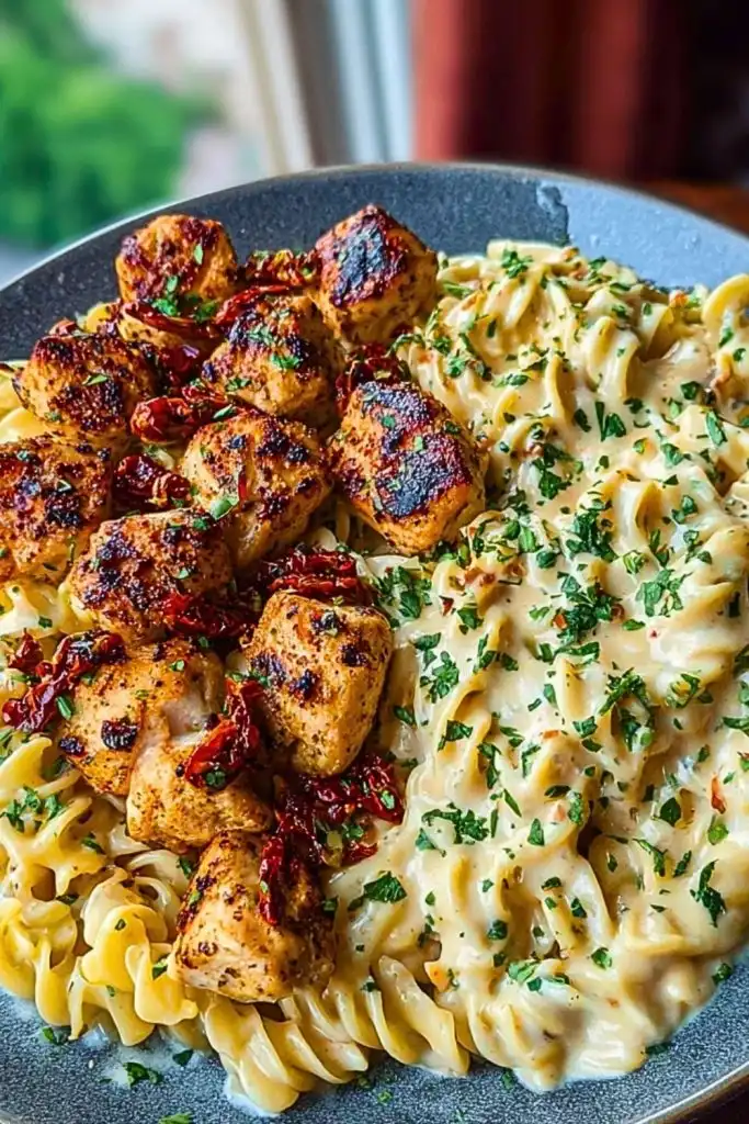 Tuscan Garlic Chicken Bites & Sun-Dried Tomato Cajun Alfredo Pasta