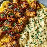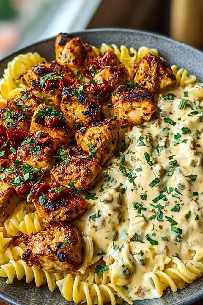 Craving something creamy, spicy, and packed with flavor? This *Tuscan Garlic Chicken Bites & Sun-Dried Tomato Cajun Alfredo Pasta* is the ultimate easy dinner recipe that combines juicy pan-seared chicken, bold Cajun spices, and a velvety homemade Alfredo sauce. Twisted rotini pasta wraps up all that goodness, while sun-dried tomatoes add a gourmet tang. Perfect for cozy nights, impressive date dinners, or quick comfort food ideas when you need something extra satisfying. A true favorite for anyone looking for bold and creamy pasta ideas!