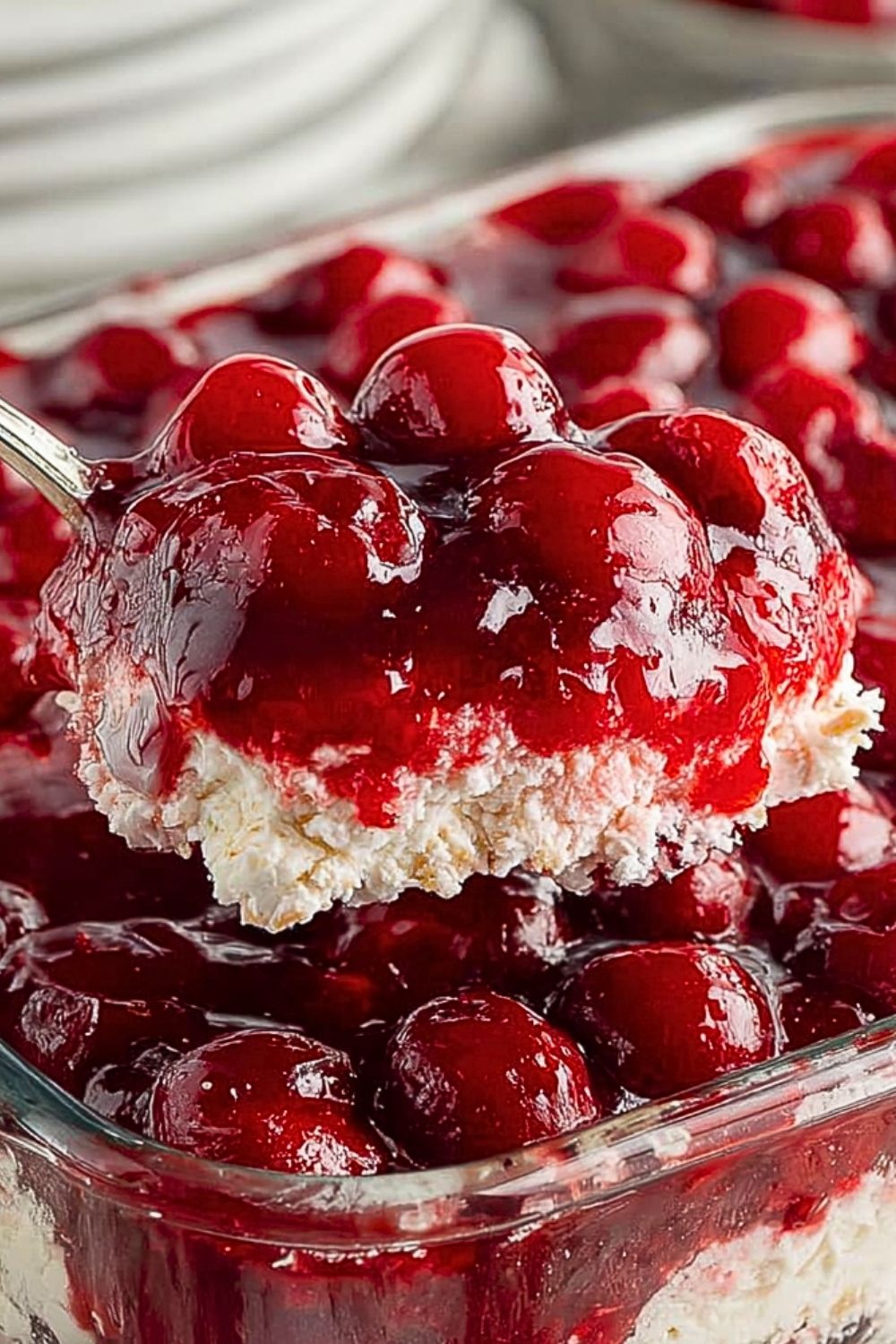 Cover the dish with plastic wrap and refrigerate for at least 4 hours, or ideally overnight. This gives the layers time to set and makes slicing easier. Serve cold and enjoy every creamy, cherry-filled bite!