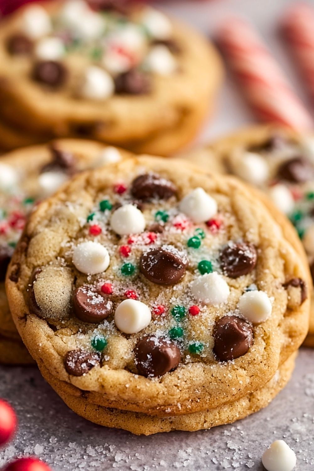 These Winter Wonderland Chocolate Chip Cookies are the ultimate festive treat to warm up your holidays. Packed with gooey chocolate chips and colorful red, green, and white candy-coated chocolates, they strike the perfect balance between soft, chewy, and slightly crisp on the edges. With a sprinkle of flaky sea salt to finish, every bite delivers nostalgic comfort and seasonal magic.